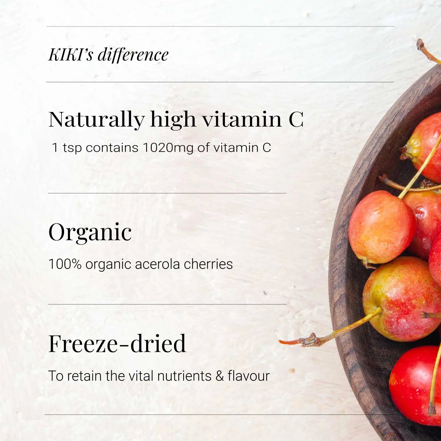 A concentrated and nutritionally dense powder made from 100% organic acerola cherries.