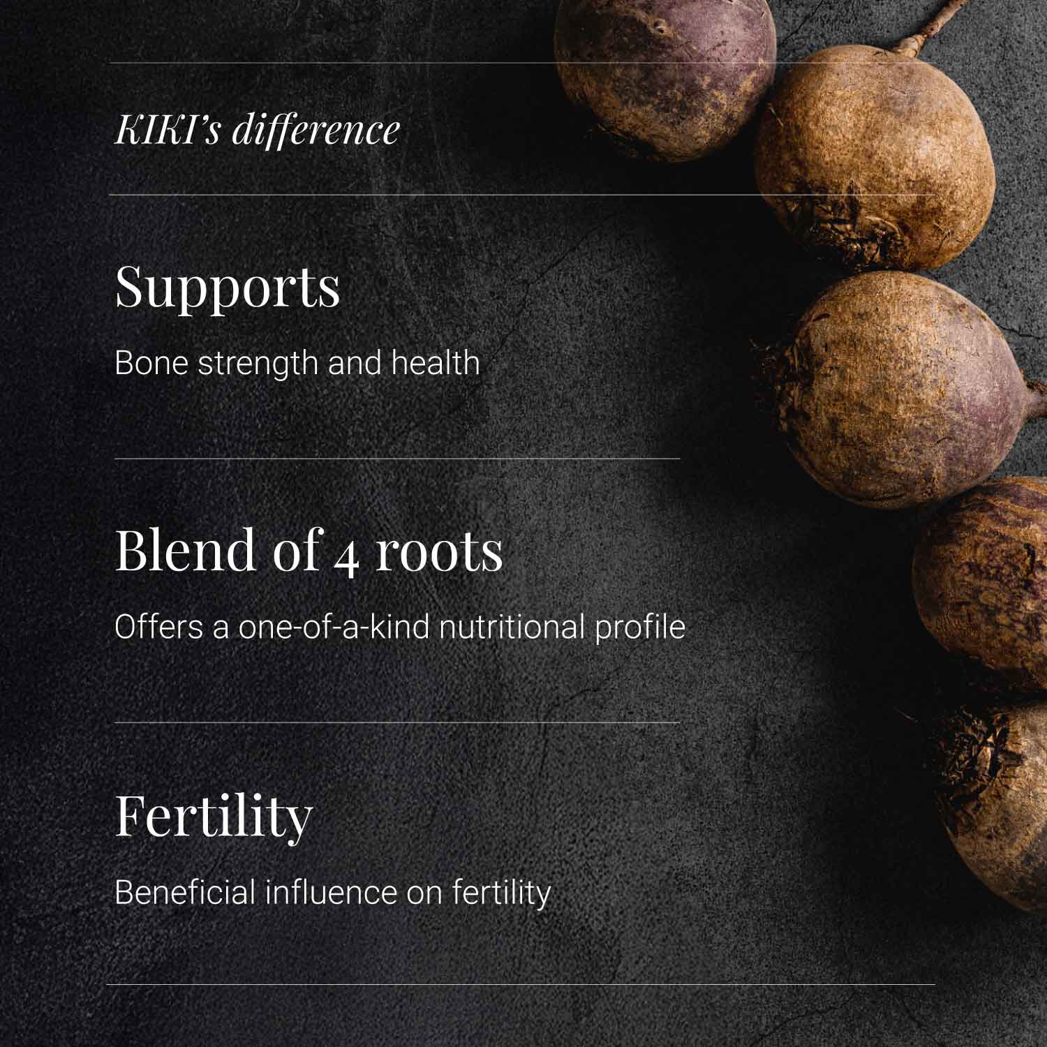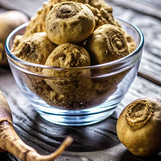 Maca comes in 4 different colours and each variety has their own unique beneficial properties. Our maca contains equal amounts of all 4 different coloured roots therefore red, yellow, purple and black.